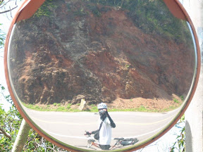 結果原來人家是有騎慢在等我...!因為前方已經要進入金崙,這一段路窄小而危險,一不小心會被車子逼到掉入路旁的水溝裡!而她有戴連著後視鏡的太陽眼鏡(第一次看到,有點像耳鼻喉科醫生的頭鏡,很酷),說可以騎在我的後頭幫我注意有無來車?這樣比較安全!喔!又是令人感動的一次,看來我今天還不太衰!