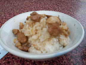 吃了麵線羹還不太飽,又點了一碗油飯。油飯也跟我想像中的有差別,比較像肉燥飯,同樣也有塊豆腐乳。以為旅社頂多只有附贈麵線羹,其他要自己付錢,當我要付油飯錢的時候,老闆說都是跟旅社算的,真是讓我再次很感動。