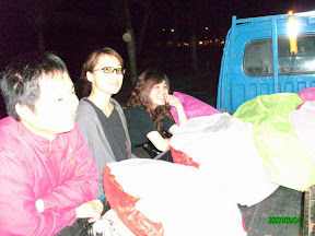 搜尋煙火的天線雷達,轉變成搜尋天燈,走了一下,讓我們看到一台發財車正在賣天燈。是三四個年輕人一起賣的,本來一個天燈要賣350元,可是因為他們快要賣完,就來個降價大拍賣變成250元。有點不太想買,覺得有點小貴,還很想殺價= =+,不過看在他們算有創意的份上,又加上有提供筆給我們寫,就決定還是買了。原本有五種顏色(每種顏色有代表的意思:白色-名利光明,藍色-增福添壽,粉紅-愛情順心,橘色,橘增智慧,紫色-好運連連),現在只剩三種顏色(白、藍、橘,看來大家都想要愛情和好運)可以挑,我們挑了橘色。接下來就寫心願啦,我第一個就寫環島順利,可是接下來要寫什麼,就一時想不到,叫學姊和崇哥寫,他們也不知道要寫什麼?哇勒,天燈就是要載滿滿滿的願望給上天知道呀,還空那麼多地方可以寫,快點想啦!!!想了半天,我們終於有點想法出現,我還寫了很白濫的東西,不過依然還是空很多空間,看來我們的野心其實很小= =!話說若干年前跟同學去平溪的時候,因為很多人,所以大家各寫幾個就滿了,可是我們現在只有三個人,要寫滿還真不容易呀!