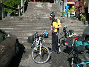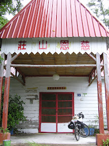 首先,我一如往常地又騎在很前頭,這時慢慢地飄起細雨來。路旁有一間小吃店,我沒停下來,料想洪大哥他們也不會停,就繼續往前騎,來到一個廢棄的派出所躲雨。剛好這裡有來走中橫的登山客一家人,他們看見我只拿出一個白飯糰來吃,很熱心的開一個鯖魚罐頭給我配著吃。當我很開心地覺得又為大家募集到食物的時候,洪大哥來了電話,說他們已經到慈恩,可是是在派出所下方的路旁休息(沒說明詳細休息點),問我要不要下去找他們?而我想說單車客是除非必要,否則不走回頭路,且派出所這裡雖然簡陋,但也不會多差,何況還有東西可吃。我就跟洪大哥說我在這裡等他們就好。