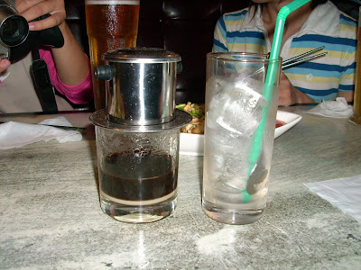 越南咖啡,原價80元,點套餐抵扣40元。會想喝越南咖啡是看美食節目的關係,有次某美食節目到越南出外景,有介紹到越南咖啡。越南咖啡是先透過左上方的鐵製容器讓咖啡一直滴下來,據說這樣咖啡會比較濃純香(從法國傳入越南),然後下方的玻璃杯裡面有煉乳,不像一般咖啡是加糖包或奶精,攪拌一下就可以喝了。想喝冰的就是加入裝有冰塊的玻璃杯裡。喝起來其實有點像咖啡牛奶,還滿好喝的,但是我覺得沒有80元的價值,再便宜一點或許比較好。甜點我就忘了照了。